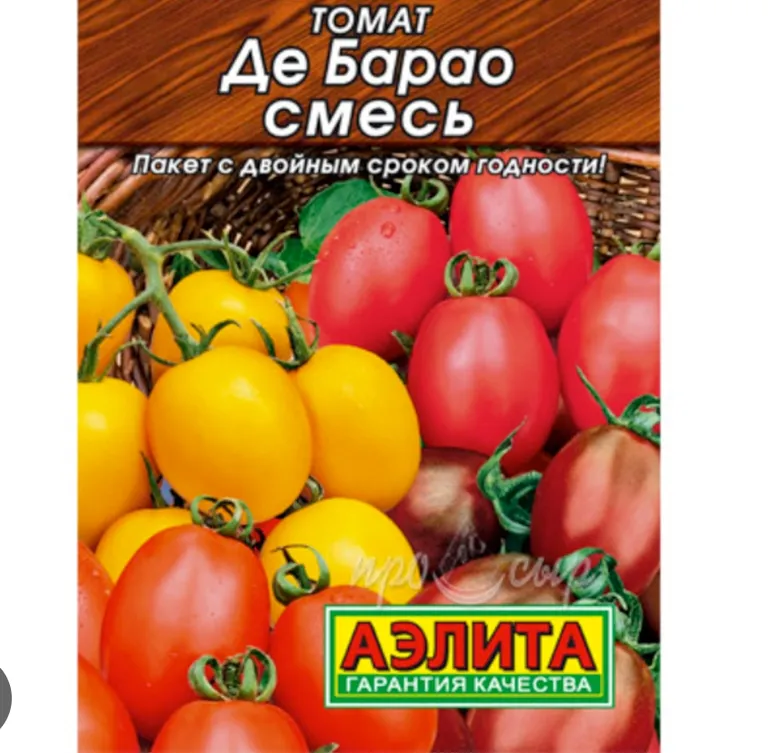 Смесь четырех популярных сортов Де Барао – с красными, оранжевыми, розовыми и черными плодами-сливками. Рекомендуется для теплиц. Растения индетерминантные, высотой 2 м. Вступают в плодоношение на 115-120 дней от всходов. Плоды массой 50-70 г, плотные, вкусные, лежкие. Для свежего потребления и цельноплодного консервирования. Урожайность 6-8 кг/м2.