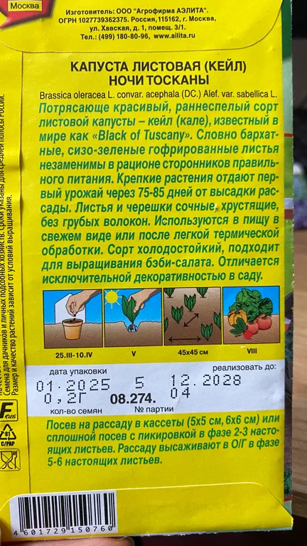 Потрясающе красивый, раннеспелый сорт листовой капусты (кале), известный в мире как Black of Tuscany. Словно бархатные, сизо-зеленые, гофрированные листья незаменимы в рационе сторонников правильного питания. Крепкие растения отдают первый урожай через 75-85 дней от высадки рассады. Листья и черешки сочные, хрустящие, без грубых волокон. Используются в пищу в свежем виде или после легкой термической обработки. Сорт холодостойкий, подходит для выращивания бэби-салата. Отличается исключительной декоративностью в саду.