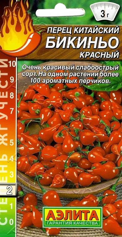 Очень интересный и урожайный сорт китайского перца. Рекомендуется для выращивания в защищенном и открытом грунте. Хорошо растет в контейнерах. Срок созревания 100-120 дней. Растение быстро растет и формирует крепкие кусты высотой 60-80 см. На одном кустике вызревает до 100 красивых и ароматных перчиков. Вкус фруктовый, сладкий, слабоострый – по шкале Сковилла 500–1000 единиц. Сорт прекрасно подходит для украшения блюд, приготовления кисло-сладких маринадов и пикантных соусов, цельноплодного консервирования и сушки.При высадке рассады не следует заглублять стебель и окучивать, т. к. у перца дополнительные корни на стебле не образуются. В теплице сорт выращивают на шпалере с формированием в 2 стебля. В первом разветвлении удаляют коронный цветок. Необходима пространственная изоляция от перца сладких сортов.