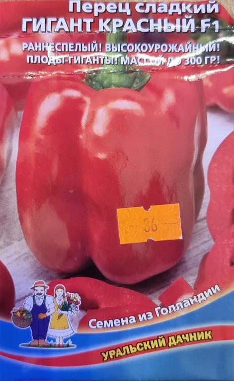 Раннеспелый гибрид для выращивания в открытом грунте и в теплицах. Плоды кубовидные, крупные, красные, массой до 300 г, размером 12x10 см, с толщиной стенки 8-12 мм, сочные, сладкие, ароматные. Гигант красный F1- один из самых толстостенных среди сладких перцев. Толщина стенки-до 1,2 см. Универсальное использование.
