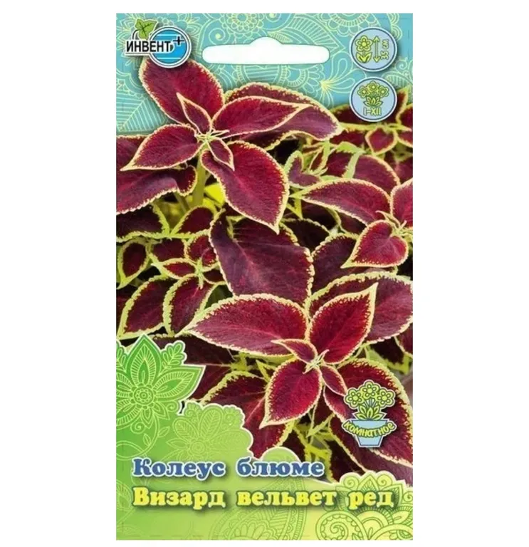 Колеус Визард Вельвет Ред — многолетнее растение из семейства Губоцветные, выращиваемое в открытом грунте как однолетнее. Компактный кустик, высотой 30-35 см, диаметром 25-30 см. Листья красно-бордовые овальные, по краям крупнозубчатые с салатовой каймой, напоминающие по форме листья крапивы. Используют для оформления бордюров, высаживают массивами, комбинируя с другими низкорослыми однолетниками.