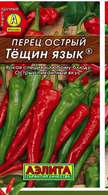 Острый перец «Тещин язык» – раннеспелый сорт для выращивания в открытом грунте и под пленкой. Растение компактное, высотой около 50 см. Плоды массой до 50 г, удлиненно-конусовидной формы, слегка изогнутые, длиной 10-12 см, красные. Вкус острый, пикантный. Аромат сильный. Не требует формирования растений. Используется в консервировании, салатах, в качестве приправы и специй. Для перца сорта «Тещин язык» пригодны суглинистые, воздухопроницаемые почвы.