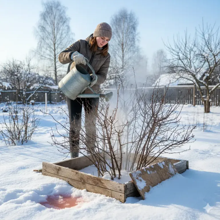 Защита корней: Если снега под кустом мало, и корни оголены, лучше прикрой приствольный круг доской или куском фанеры, чтобы горячая вода не попала на нежные корешки.