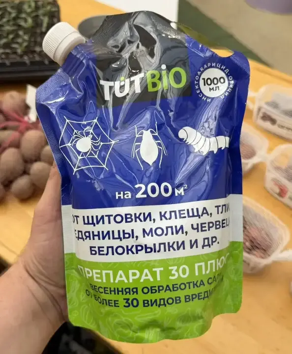 Баковая смесь на 10 л воды: 100 гр медного купороса и 500 мл Препарат 30+. Вначале растворяем купорос в 5 литрах воды и вливаем в бак распылителя, затем растворяем препарат 30+ в 5 литрах воды и вливаем в раствор медного купороса, тщательно перемешиваем и сразу же опрыскиваем деревья и кустарники по веткам так. Чтобы препарат стекал по веткам. Периодически при опрыскивании перемешиваем баковую смесь. Смесь не хранится, использовать в течении часа. Уничтожаем зимующих вредителей и болезни.