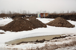 Подведя домик почти под крышу мы решили оставить все до лета, но не тут то было. Добрые люди посоветовали подсушить участок:)) Мы сняли весь грунт с участка завезли 40!!! машин песка (думаю конечно с количеством нас напарили, мы ж были начинающие)