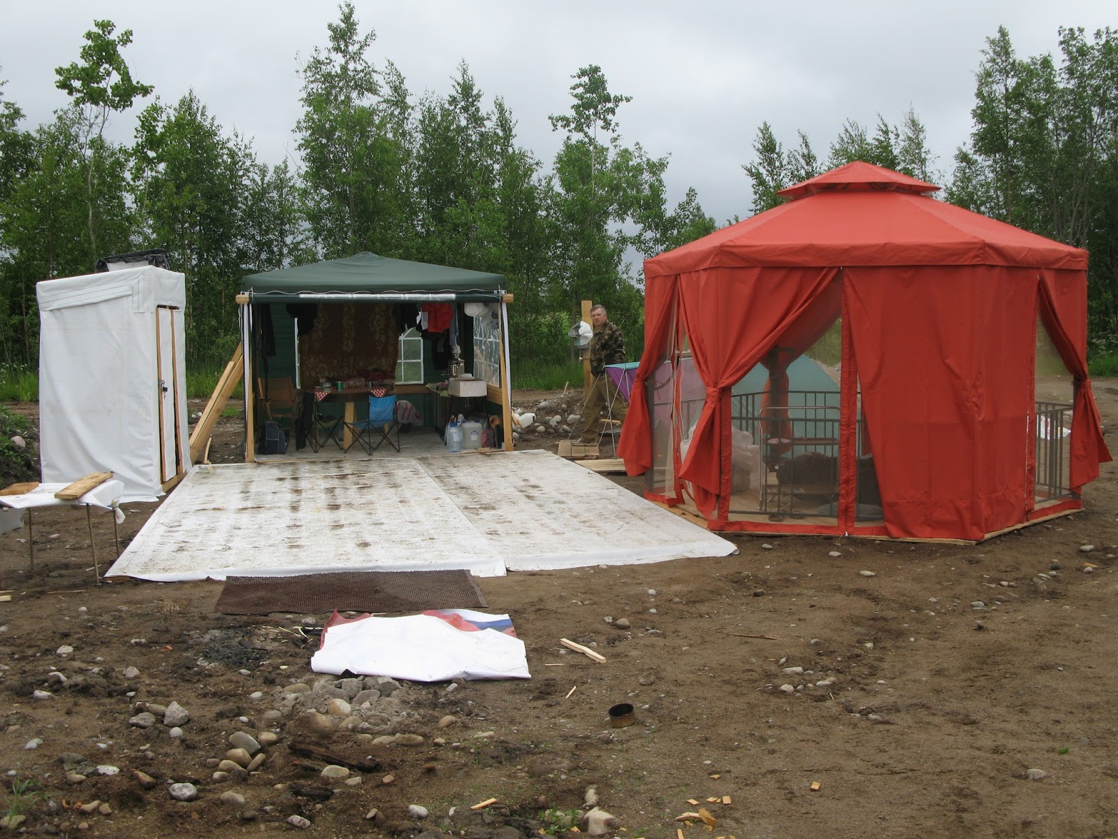 Наши первые хоромы: туалет, душ, кухня, палатка и комната (шатер) отдыха |